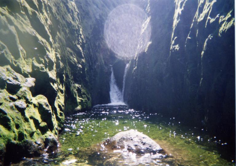 渓に入って2時間30分ほど、ザクロ谷F1が見えて来ます。少し泳いで手前の堰堤状の岩まで行き、腰程度の深さでその先の中洲の様な岩まで。その先は、滝壷まで背が立たない深さで両岸は高さ100Mもありそうなつるつるの苔むした岸壁。さらに、F1の先は日本有数のゴルジュ。しばらく滝を眺めて今日の終了点としました。(おくの記)
