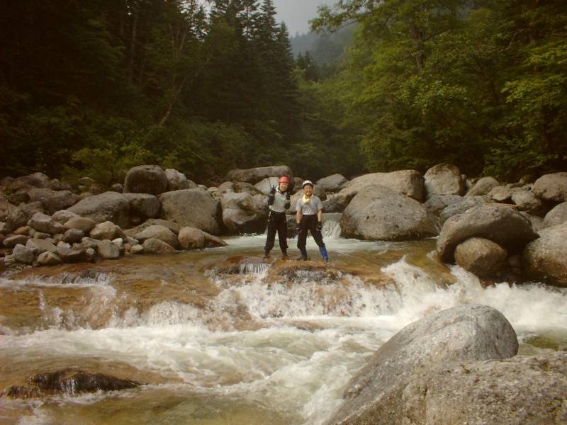 いよいよここからが本番である。いきなり急な岩を登り始める。うぅぅこの先こんな岩登りが続くのかぁと思いながらも水の流れるところ流れるところをグングン登っていく。F氏は困難な岩を好んでは登っていくがついていけない。挙句の果てには深見にはまって転んでしまい、右親指の靭帯を切ってしまった。(靭帯を切るのは足に続いて2度目、なんとなく切れたときの痛みが身についたわ。)
